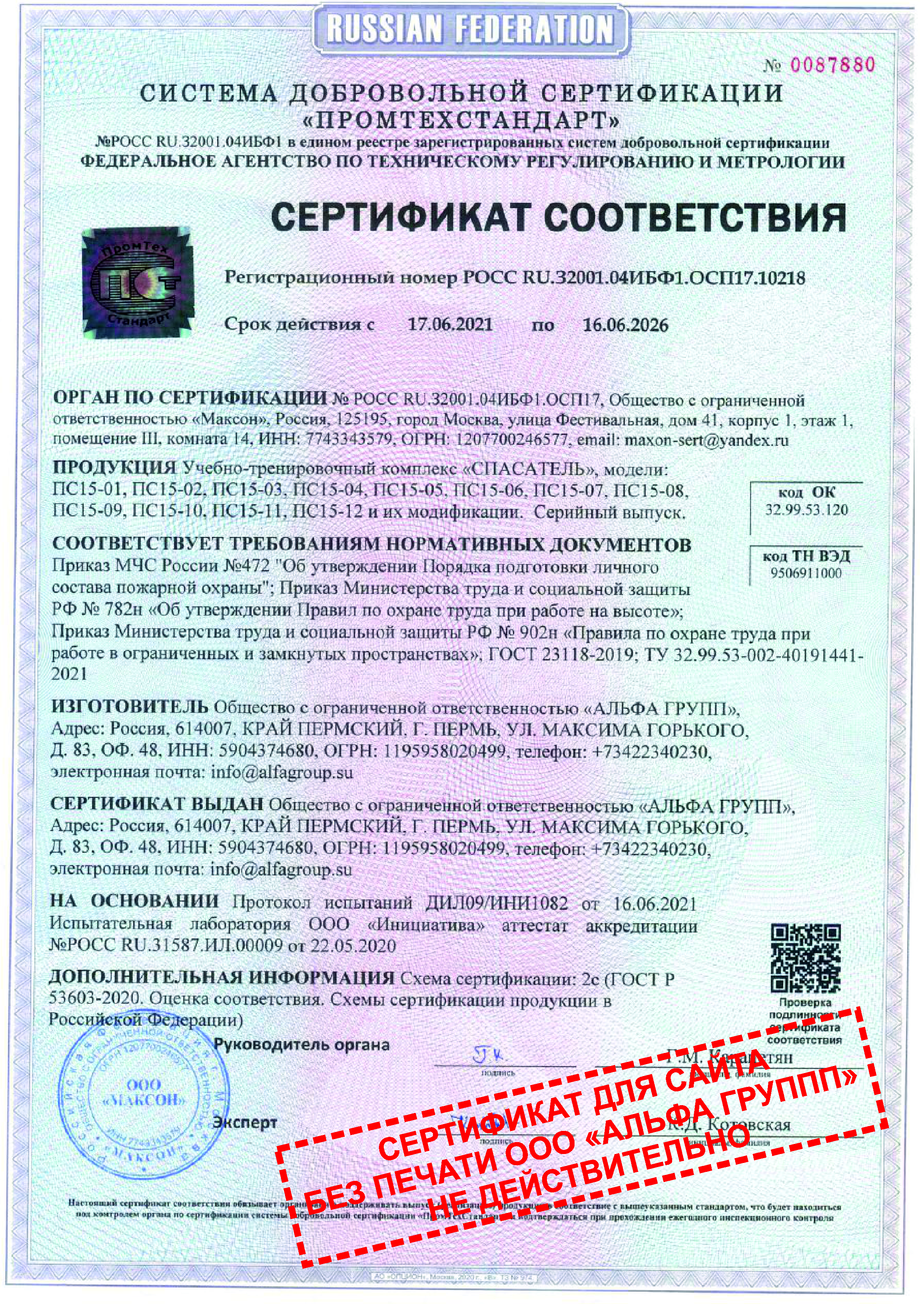 • Учебные комплексы «СПАСАТЕЛЬ» сертифицированы и изготавливаются по Техническим условиям ООО «АЛЬФА ГРУПП» Полигон учебно-тренировочный ТУ 32.99.53-002-40191441-2021.